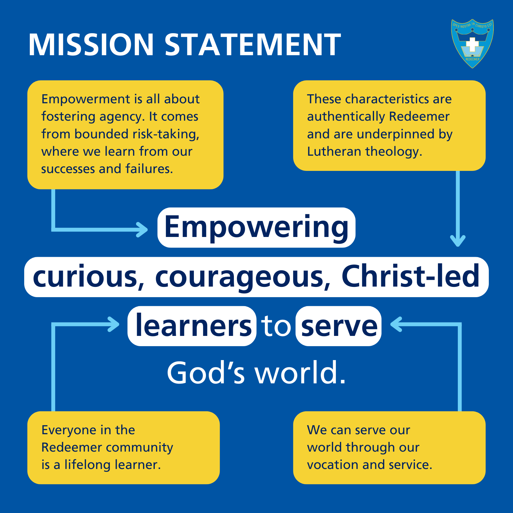 Redeemer is a school in which all teaching, learning and all other activities take place in the context of the Christian faith as understood and taught by the Lutheran Church of Australia.